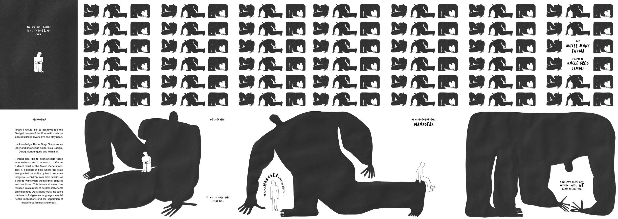 To produce a zine which visually adapts ‘The White Man’s Thumb’ — a story told by Uncle Greg Simms, an Elder and knowledge holder, Gadigal, Darug, Gundungurra and Yuin man.